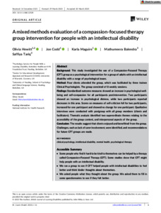 Hewitt, O. ORCID: https://orcid.org/0000-0002-6393-2388, Codd, J. ORCID: https://orcid.org/0000-0002-3941-9701, Maguire, K. ORCID: https://orcid.org/0000-0003-3059-0403, Balendra, M. and Tariq, S. (2023) A mixed methods evaluation of a compassion‐focused therapy group intervention for people with an intellectual disability. British Journal of Learning Disabilities, 51 (4). pp. 522-533. ISSN 1468-3156 doi: 10.1111/bld.12528