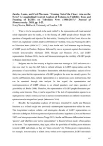 What is it to be recognized, to be made visible? Is the representation of visual material solely dependent upon the media, or is the framing of LGBT people always fraught with questions of inequality and injustice? In their article, ‘Coming Out of the Closet, Also on the News? A Longitudinal Content Analysis of Patterns in Visibility, Tone, and Framing of LGBTs on Television News (1986 -2017)’ (2020), Laura Jacobs and Cecil Meeusen map the framing of LGBT people in Flanders, Belgium. Informed by recent arguments against discrimination towards homosexuality (Gerhards 2010; Hooghe and Meeusen 2013), and LGBT representation (Redman 2018), Jacobs and Meeusen interrogate the visibility of LGBT people in Belgian mainstream media.