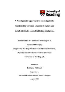 Alathari, B. (2022) A Nutrigenetic approach to investigate the relationship between vitamin D status and metabolic traits in multiethnic populations. PhD thesis, University of Reading. doi: 10.48683/1926.00111842