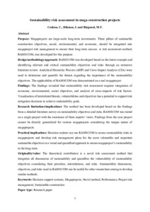 Purpose: Megaprojects are large-scale long-term investments. Three pillars of sustainable construction objectives, social, environmental, and economic, should be integrated into megaproject risk management to ensure their long-term success. A risk assessment method, RAMSCOM, was developed for this purpose. Design/methodology/approach: RAMSCOM was developed based on the latest concepts and identifying relevant and critical sustainability objectives and risks through an extensive literature review. Analytical Hierarchy Process (AHP) and Cross-Impact Analysis (CIA) were used to determine and quantify the threats regarding the importance of the sustainability objectives. The applicability of RAMSCOM was demonstrated on a real megaproject. Findings: The findings revealed that sustainability risk assessment requires integration of economic, environmental, social objectives, and analysis of cross-impacts of risk factors. Visualisation of interrelated threats, vulnerabilities and objectives has a potential to support risk mitigation decisions to achieve sustainability goals. Research limitations/implications: The method has been developed based on the findings from a detailed literature survey on sustainability objectives and risks. RAMSCOM was tested on a single project with the assistance of three experts’ views. Findings from the case project cannot be directly generalized for various megaprojects considering the unique nature of megaprojects. Practical implications: Decision-makers can use RAMSCOM to assess sustainability risks in megaprojects and develop risk management plans for the most vulnerable and important sustainable objectives in a visual and quantified approach to ensure megaproject’s sustainability in the long-term. Originality/value: The theoretical contribution is a novel risk assessment method that integrates all dimensions of sustainability and quantifies the vulnerability of sustainability objectives considering their priorities, interrelations, and risks. Sustainability dimensions, objectives, and risks used in RAMSCOM can be useful for other researchers aiming to develop similar methods.
