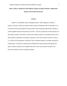 Based to a considerable extent on Margaret Archer’s (2007) approach to reflexive agency, we discuss a multi-year insider/outsider research collaboration that has taken place in a University-based Centre designed to bring academics and management practitioners together to conduct applied research and learn from each other. We focus in particular on the experiences of the insider researcher, showing how, based on her reflexive practice, the collaboration has led to both scholarly contributions and changes in practice in the Centre and her University. In doing so, we flesh out the importance of reflexivity and its important impacts in academic-practitioner collaborations. In long term insider/outsider collaborations that provide psychologically safe places, outsider researchers can metaphorically hold a mirror up to insider researchers that fosters their reflexivity and its subsequent impacts.
