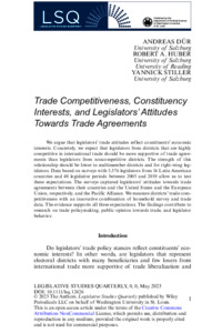 Dür, A., Huber, R. A. ORCID: https://orcid.org/0000-0001-6536-9392 and Stiller, Y. (2024) Trade competitiveness, constituency interests, and legislators’ attitudes towards trade agreements. Legislative Studies Quarterly, 49 (2). pp. 353-382. ISSN 1939-9162 doi: 10.1111/lsq.12426