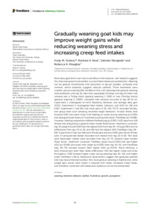 Vickery, H. M. ORCID: https://orcid.org/0000-0001-7533-1136, Neal, R.A. ORCID: https://orcid.org/0000-0001-5017-7283, Stergiadis, S. ORCID: https://orcid.org/0000-0002-7293-182X and Meagher, R. K. (2023) Gradually weaning goat kids may improve weight gains whilst reducing weaning stress and increasing creep feed intakes. Frontiers in Veterinary Science, 10. ISSN 2297-1769 doi: 10.3389/fvets.2023.1200849