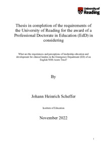 Scheffer, J. H. (2022) What are the experiences and perceptions of leadership education and development for clinical leaders in the Emergency Department (ED) of an English NHS Acute Trust? EdD thesis, University of Reading. doi: 10.48683/1926.00111962