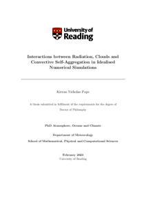 Pope, K. N. (2023) Interactions between radiation, clouds and convective self-aggregation in idealised numerical simulations. PhD thesis, University of Reading. doi: 10.48683/1926.00111980