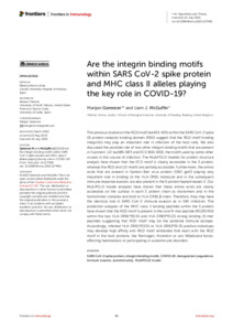 Gerencer, M. and McGuffin, L. J. ORCID: https://orcid.org/0000-0003-4501-4767 (2023) Are the integrin binding motifs within SARS CoV-2 spike protein and MHC class II alleles playing the key role in COVID-19? Frontiers in Immunology, 14. ISSN 1664-3224 doi: 10.3389/fimmu.2023.1177691