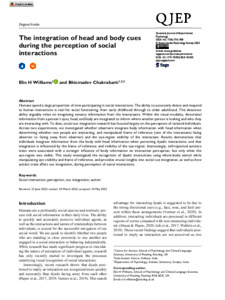 Humans spend a large proportion of time participating in social interactions. The ability to accurately detect and respond to human interactions is vital for social functioning, from early childhood through to older adulthood. This detection ability arguably relies on integrating sensory information from the interactants. Within the visual modality, directional information from a person’s eyes, head, and body are integrated to inform where another person is looking and who they are interacting with. To date, social cue integration research has focused largely on the perception of isolated individuals. Across two experiments, we investigated whether observers integrate body information with head information when determining whether two people are interacting, and manipulated frame of reference (one of the interactants facing observer vs. facing away from observer) and the eye-region visibility of the interactant. Results demonstrate that individuals integrate information from the body with head information when perceiving dyadic interactions, and that integration is influenced by the frame of reference and visibility of the eye-region. Interestingly, self-reported autistics traits were associated with a stronger influence of body information on interaction perception, but only when the eye-region was visible. This study investigated the recognition of dyadic interactions using whole-body stimuli while manipulating eye visibility and frame of reference, and provides crucial insights into social cue integration, as well as how autistic traits affect cue integration, during perception of social interactions.