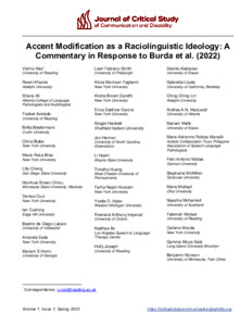 Nair, V. ORCID: https://orcid.org/0000-0001-6631-0587, Khamis, R., Ali, S., Aveledo, F. ORCID: https://orcid.org/0000-0002-7736-1600, Biedermann, B., Blake, O., Rosa Brea, M., Cheng, L., Sheen Chiou, H., Cruz, D., Cushing, I., de Diego-Lázaro, B., Eads, A., El Amin, M., Fabiano-Smith, L., Morrison Fagbemi, A., Brown Gandhi, A., Saldívar García, E., Hackett, A., Henner, J., Hsieh, L., Huang, T., Hussain, F. N., Hyter, Y. D., Imperial Rowland, A., Ito, N., Joseph, H. ORCID: https://orcid.org/0000-0003-4325-4628, Kašćelan, D., Licata, G., Lin, C.-C., MacLeod, A. A.N., Malik, M., Robles Manalili, M. A., Matias, F. A., McMillen, S., Modayil, M., Mohamed, N., Mollaei, F. ORCID: https://orcid.org/0000-0003-2916-9750, Monda, D., Moya-Galé, G., Munson, B., Nkomo, C., Padia, L., Perez, C., Privette, C., Risueño, P., Rodgers, L., Rodríguez-Guerra, M., Serratrice, L. ORCID: https://orcid.org/0000-0001-5141-6186, Shannon, D. B., Soto-Boykin, X., Tan, G., Sun, L., Wylie, K., Yu, B., Yu, V. and Zisk, A. H. (2023) Accent modification as a raciolinguistic ideology: a commentary in response to Burda et al. (2022). Journal of Critical Study of Communication and Disability, 1 (1). pp. 105-112. doi: 10.48516/jcscd_2023vol1iss1.21