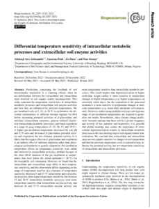 Adekanmbi, A. A. ORCID: https://orcid.org/0000-0003-3379-4161, Dale, L., Shaw, L. and Sizmur, T. ORCID: https://orcid.org/0000-0001-9835-7195 (2023) Differential temperature sensitivity of intracellular metabolic processes and extracellular soil enzyme activities. Biogeosciences, 20 (11). pp. 2207-2219. ISSN 1726-4170 doi: 10.5194/bg-20-2207-2023