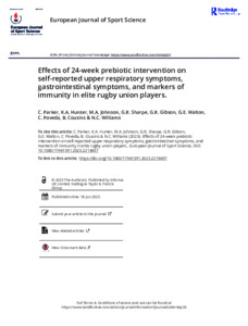 Parker, C., Hunter, K. A., Johnson, M. A., Sharpe, G. R., Gibson, G. R. ORCID: https://orcid.org/0000-0002-0566-0476, Walton, G. E. ORCID: https://orcid.org/0000-0001-5426-5635, Poveda, C., Cousins, B. and Williams, N. C. (2023) Effects of 24-week prebiotic intervention on self-reported upper respiratory symptoms, gastrointestinal symptoms, and markers of immunity in elite rugby union players. European Journal of Sport Science, 23 (11). pp. 2232-2239. ISSN 1746-1391 doi: 10.1080/17461391.2023.2216657
