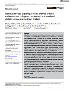 Chidimuro, B., Doherty, S., Finch, J., Ponce, P., Eggington, J., Delaney, S., Speller, C., Collins, M. J., Holst, m. and Alexander, M. (2023) North & South: exploring isotopic analysis of bone carbonates and collagen to understand post-medieval diets in London and northern England. American Journal of Biological Anthropology, 182 (1). pp. 126-142. ISSN 1537-2707 doi: 10.1002/ajpa.24818