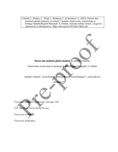 Cabrelli, J. ORCID: https://orcid.org/0000-0002-7139-740X, Pichan, C., Ward, J., Rothman, J. and Serratrice, L. ORCID: https://orcid.org/0000-0001-5141-6186 (2023) Factors that moderate global similarity in initial L3 transfer. Intervocalic voiced stops in heritage Spanish/English bilinguals’ L3 Italian. Linguistic Approaches to Bilingualism, 13 (5). pp. 638-662. ISSN 1879-9272 doi: 10.1075/lab.22062.cab
