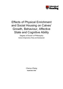 Dairy calves are commonly reared in artificial environments in the dairy industry. It is essential to understand and satisfy their motivations so as to improve their welfare, promote their behavioural and cognitive development and increase their growth and adaptability to environmental changes. The first aim of this dissertation was to study effective ways to complicate calves’ housing environments and understand how the environment complexity impacts behaviour and improves calves’ welfare. We investigated the effectiveness of physical enrichment protocols and determined calves’ preferences for and ways of interacting with various physical enrichment items. A fixed multi-item enrichment presentation schedule was considered an effective protocol. Nets filled with scented hay seemed to be the most attractive item tested, which stimulated calves to show five types of interaction behaviours towards them. We then determined how the provision of the physical enrichment items in the effective protocol identified, pair housing, and the combination of both components in calves’ pre-weaning period affect pre- and post-weaning weight gain, pre- and post-weaning behaviours, fear responses to novelty and memory ability. We found that adding complexity to pre-weaning calves’ housing environments using the three methods appeared likely to improve their welfare by providing outlets for natural behaviours, mitigating undesirable behaviours, promoting growth, increasing behavioural flexibility or improving memory ability. In addition, since calves’ fear responses in repeated fear tests are inconsistent, this dissertation also aimed to investigate the potential mechanisms resulting in this uncertain reliability. We investigated whether calves have visual lateralization in 8 processing fear in novel object tests and if initial monocular presentation of novel objects affects calves’ fear responses. The results suggested that the poor test-retest reliability in repeated novel object tests could not be explained by visual lateralization in processing fear, and eye laterality might not be considered a useful measure of fear at this age.