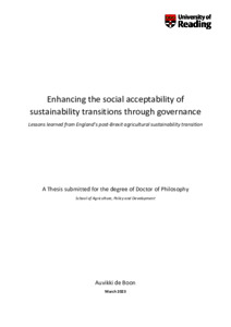 De Boon, A. (2023) Enhancing the social acceptability of sustainability transitions through governance : lessons learned from England’s post-Brexit agricultural sustainability transition. PhD thesis, University of Reading. doi: 10.48683/1926.00112809