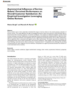 Borghi, M. ORCID: https://orcid.org/0000-0002-4150-1595 and Mariani, M. ORCID: https://orcid.org/0000-0002-7916-2576 (2024) Asymmetrical influences of service robots’ perceived performance on overall customer satisfaction: an empirical investigation leveraging online reviews. Journal of Travel Research. pp. 1086-1111. ISSN 1552-6763 doi: 10.1177/00472875231190610