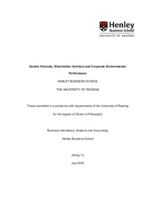 Yu, J. (2023) Gender diversity, shareholder activism and corporate environmental performance. PhD thesis, University of Reading. doi: 10.48683/1926.00113034
