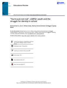 Harris, R. ORCID: https://orcid.org/0000-0001-8606-5515, Wilson-Daily, A. E., Kemmelmeier, M. and Copsey-Blake, M. (2025) ‘You’re just not real’: LGBTQ+ youth and the struggle for identity in school. Educational Review, 77 (4). pp. 1085-1104. ISSN 1465-3397 doi: 10.1080/00131911.2023.2254514
