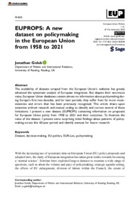 Golub, J. ORCID: https://orcid.org/0000-0002-2686-139X (2024) EUPROPS: a new dataset on policymaking in the European Union 1958-2021. European Union Politics, 25 (1). pp. 197-217. ISSN 1741-2757 doi: 10.1177/14651165231202034