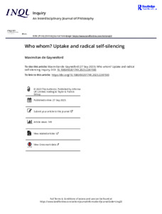 De Gaynesford, M. ORCID: https://orcid.org/0000-0002-2715-6342 (2023) Who whom? Uptake and radical self-silencing. Inquiry: An Interdisciplinary Journal of Philosophy. ISSN 1502-3923 doi: 10.1080/0020174X.2023.2261500