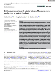 Al-Shaer, H., Liu, Y. S. ORCID: https://orcid.org/0000-0002-3012-0973 and Albitar, K. (2024) Driving business towards a better climate: macro and micro mechanisms to protect the planet. Business Strategy and the Environment, 33 (3). pp. 1810-1833. ISSN 0964-4733 doi: 10.1002/bse.3575