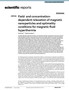 Ilg, P. ORCID: https://orcid.org/0000-0002-7518-5543 and Kröger, M. (2023) Field- and concentration-dependent relaxation of magnetic nanoparticles and optimality conditions for magnetic fluid hyperthermia. Scientific Reports, 13. 16523. ISSN 2045-2322 doi: 10.1038/s41598-023-43140-8