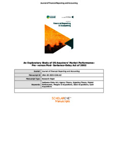 Purpose – Motivated by the findings of Bhabra and Hossain (2017) that highlight an improvement in US market performance in the post-SOX period, we investigate how this change varies with the methods of payment used for the deals. Design/methodology/approach – Deductive in nature and using an event study approach, this paper uses a sample of 675 deals between 1999 and 2006 to test three research hypotheses in a pre-post setting. Findings – Results show that at the aggregate level, there is a significant improvement in the market performance of US acquirers around the announcement day in the aftermath of the passage of SOX 2002. Considered separately, both US stock acquirers and cash acquirers did not experience any significant improvement in market performance in the post-SOX period. These results are robust to controlling for governance, firm and deal variables, as well as industry and year fixed effects. Research limitations – Exploratory in nature, the results are to be interpreted in light of the sample size and the period under investigation. Practical implications – The results provide evidence for regulators and legislators on the contribution of SOX 2002 to curbing managerial misconduct. Significant improvement in the market performance also signals more confidence in managerial decisions and a reduction in agency problems. The insignificant change in stock acquirers’ market performance can be an indication that policymakers should exert more efforts to improve shareholders' confidence in the quality of disclosure. Originality/value – This investigation provides unique insights on whether SOX has been effective in mitigating mispricing concerns associated with stock-financed acquisitions and whether it was effective in moderating the governance mechanism associated with cash-financed acquisitions. Keywords US Acquirers’ Market Performance, Sarbanes-Oxley Act, Agency Theory, Signaling Theory, Stock acquisitions, Cash acquisitions.