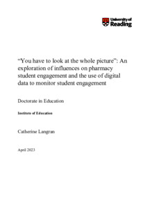 Langran, C. ORCID: https://orcid.org/0000-0001-5186-4528 (2023) “You have to look at the whole picture”: An exploration of influences on pharmacy student engagement and the use of digital data to monitor student engagement. EdD thesis, University of Reading. doi: 10.48683/1926.00113455