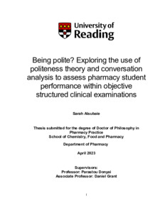 Alsubaie, S. (2023) Being polite? Exploring the use of politeness theory and conversation analysis to assess pharmacy student performance within objective structured clinical examinations. PhD thesis, University of Reading. doi: 10.48683/1926.00113472