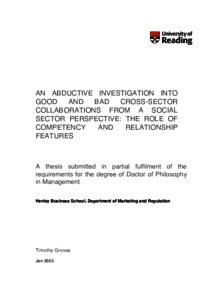 Groves, T. (2023) An abductive investigation into good and bad cross-sector collaborations from a social sector perspective: the role of competency and relationship features. PhD thesis, University of Reading. doi: 10.48683/1926.00113607