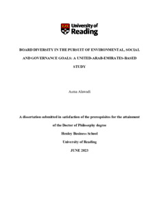 Alawadi, A. (2023) Board diversity in the pursuit of environmental, social and governance goals: a United-Arab-Emirates-based study. PhD thesis, University of Reading. doi: 10.48683/1926.00113656