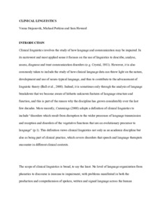 This chapter provides an overview of the scope of clinical linguistics, a review of topics and issues covered within clinical linguistics, current research advances and future directions, and recommendations for clinical practice.