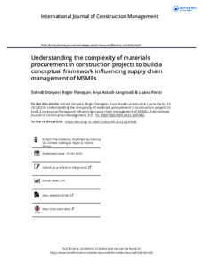 Donyavi, S., Flanagan, R., Assadi-Langroudi, A. and Parisi, L. (2024) Understanding the complexity of materials procurement in construction projects to build a conceptual framework influencing supply chain management of MSMEs. International Journal of Construction Management, 24 (2). pp. 177-186. ISSN 2331-2327 doi: 10.1080/15623599.2023.2267862