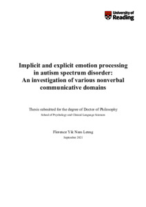 Leung, F. Y. N. (2022) Implicit and explicit emotion processing in autism spectrum disorder: an investigation of various nonverbal communicative domains. PhD thesis, University of Reading. doi: 10.48683/1926.00113748