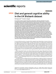 Hepsomali, P. ORCID: https://orcid.org/0000-0001-5812-1081 and Groeger, J. A. (2021) Diet and general cognitive ability in the UK Biobank dataset. Scientific Reports, 11. 11786. ISSN 2045-2322 doi: 10.1038/s41598-021-91259-3