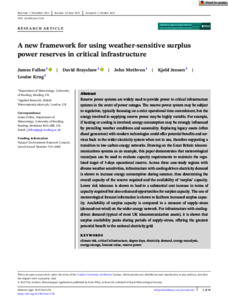 Reserve power systems are widely used to provide power to critical infrastructure systems in the event of power outages. The reserve power system may be subject to regulation, typically focussing on a strict operational time commitment, but the energy involved in supplying reserve power may be highly variable. For example, if heating or cooling is involved, energy consumption may be strongly influenced by prevailing weather conditions and seasonality. Replacing legacy assets (often diesel generators) with modern technologies could offer potential benefits and services back to the wider electricity system when not in use, therefore supporting a transition to low-carbon energy networks. Drawing on the Great Britain telecommunications systems as an example, this paper demonstrates that meteorological reanalyses can be used to evaluate capacity requirements to maintain the regulated target of 5-days operational reserve. Across three case-study regions with diverse weather sensitivities, infrastructure with cooling-driven electricity demand is shown to increase energy consumption during summer, thus determining the overall capacity of the reserve required and the availability of ‘surplus’ capacity. Lower risk tolerance is shown to lead to a substantial cost increase in terms of capacity required but also enhanced opportunities for surplus capacity. The use of meteorological forecast information is shown to facilitate increased surplus capacity. Availability of surplus capacity is compared to a measure of supply–stress (demand-net-wind) on the wider energy network. For infrastructure with cooling-driven demand (typical of most UK telecommunication assets), it is shown that surplus availability peaks during periods of supply–stress, offering the greatest potential benefit to the national electricity grid.