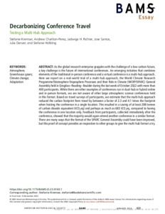 Kremser, S., Charlton-Perez, A. ORCID: https://orcid.org/0000-0001-8179-6220, Richter, J. H., Santos, J., Danzer, J. and Hölbling, S. (2024) Decarbonizing conference travel: testing a multi-hub approach. Bulletin of the American Meteorological Society, 105 (1). E21-E31. ISSN 1520-0477 doi: 10.1175/bams-d-23-0160.1