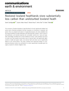 Duddigan, S. ORCID: https://orcid.org/0000-0002-6228-4462, Hales-Henao, A., Bruce, M., Diaz, A. and Tibbett, M. ORCID: https://orcid.org/0000-0003-0143-2190 (2024) Restored lowland heathlands store substantially less carbon than undisturbed lowland heath. Communications Earth & Environment, 5 (1). 15. ISSN 2662-4435 doi: 10.1038/s43247-023-01176-8