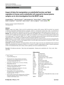 Purpose Longer-term intake of fatty acid (FA)-modified dairy products (SFA-reduced, MUFA-enriched) was reported to attenuate postprandial endothelial function in humans, relative to conventional (control) dairy. Thus, we performed an in vitro study in human aortic endothelial cells (HAEC) to investigate mechanisms underlying the effects observed in vivo. Methods This sub-study was conducted within the framework of the RESET study, a 12-week randomised controlled crossover trial with FA-modified and control dairy diets. HAEC were incubated for 24 h with post-intervention plasma samples from eleven adults (age: 57.5±6.0 years; BMI: 25.7±2.7 kg/m2 ) at moderate cardiovascular disease risk following representative sequential mixed meals. Markers of endothelial function and lipid regulation were assessed. Results Relative to control, HAEC incubation with plasma following the FA-modified treatment increased postprandial NOx production (P-interaction=0.019), yet up-regulated relative E-selectin mRNA gene expression (P-interaction=0.011). There was no impact on other genes measured. Conclusion Incubation of HAEC with human plasma collected after longer-term dairy fat manipulation had a beneficial impact on postprandial NOx production. Further ex vivo research is needed to understand the impact of partial replacement of SFA with unsaturated fatty acids in dairy foods on pathways involved in endothelial function.