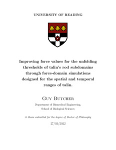 Butcher, G. (2022) Improving force values for the unfolding thresholds of talin’s rod subdomains through force-domain simulations designed for the spatial and temporal ranges of talin. PhD thesis, University of Reading. doi: 10.48683/1926.00114682