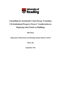 Du, D. (2022) Assembling for sustainable urban energy transition: UK institutional property owners’ consideration on deploying solar panels on buildings. PhD thesis, University of Reading. doi: 10.48683/1926.00114739