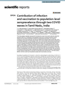 Selvavinayagam, T. S., Somasundaram, A., Selvam, J. M., Sampath, P., Vijayalakshmi, V., Kumar, C. A. B., Subramaniam, S., Kumarasamy, P., Raju, S., Avudaiselvi, R., Prakash, V., Yogananth, N., Subramanian, G., Roshini, A., Dhiliban, D. N., Imad, S., Tandel, V., Parasa, R., Sachdeva, S., Ramachandran, S. and Malani, A. (2024) Contribution of infection and vaccination to population-level seroprevalence through two COVID waves in Tamil Nadu, India. Scientific Reports, 14. 2091. ISSN 2045-2322 doi: 10.1038/s41598-023-50338-3