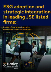 The purpose of the study was to explore how firms are adopting the ESG agenda and the challenges, tensions, dilemmas, and approaches faced by firms in integrating ESG factors in the strategy cycle. This report is the result of a research collaboration between Risk Insights and Henley Business School Africa. The research programme comprises three stages: i) an in-depth literature review; ii) interviews with senior business leaders from JSE listed organisations; and iii) a survey of the JSE listed firms. This white paper systematises the insights obtained by the research team from the literature review and 15 in-depth interviews with senior business leaders from JSE listed firms. Various key themes emerged from this analysis, which are explored, supported by data from the interview material, and complemented by literature insights. The report is organised into five parts: The nature of ESG: interpretations and motivations for adoption; • The board of directors and ESG strategy development; • Implementing the ESG strategy: progress, challenges, and barriers; • Communicating the ESG strategy performance; and • Conclusion.