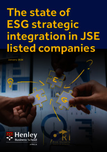 This second report, titled The state of ESG integration in JSE listed companies, is based on the results of an extensive survey of Johannesburg Stock Exchange (JSE) listed firms. The survey was divided into several sections, including demographics, motivations for environmental, social, and governance (ESG) adoptions, stakeholder pressure and engagement, materiality approaches, board involvement and governance of ESG, ESG strategy implementation and barriers, and ESG reporting and frameworks. The survey was distributed to JSE listed companies through several means, including a market research agency. In total, there were 63 complete and valid responses to the survey, which served as the basis of the results documented in this report. Respondents who completed the survey on behalf of their companies included chief operating officers (31), ESG/sustainability heads/senior management (21), company secretaries (four), chief executives (three), non-executive directors (three), and a chairperson (one). Majority of companies were large or very large, with 30% employing over 10 000 employees, 22% between 5 000 and 10 000 employees, and 21% between 1 000 and 5 000 employees. In terms of sales, 70% of the sample companies reported annual revenues of R90 billion. Most companies were from the consumer discretionary industry (18), followed by the financial (14), industrial (10), consumer staples (eight), basic materials (six), technology (three), real estate (two), and energy (two) industries. The Henley-Risk Insights survey revealed that corporate South Africa has made significant efforts towards the adoption and integration of ESG factors on their businesses. Nevertheless, there is still much to be done. Corporate South Africa needs to continue to work on the purpose and rationale for sustainability that makes ESG an integral part of the corporate strategy. Competitive motives and marketplace stakeholders remain low in terms of motivations, pressure, and engagement for ESG adoption and integration. Significant ESG-driven strategic moves, such as asset divestment, mergers and acquisitions, change of distribution channels, and joint ventures, are not so common. Until ESG becomes an integral part of the competitive game, the progress will be incremental at best and often illusive. Most barriers to ESG strategic execution remain internal and within corporate control, depicting significant tensions between business and ESG rationales. There is a clear prioritisation of social factors vis-à-vis environmental and even governance factors. However, corporates must recognise that social and environmental factors are often intertwined, and failure to keep up on the environmental side may cost corporates and South Africa the ability to create jobs that are desperately needed.