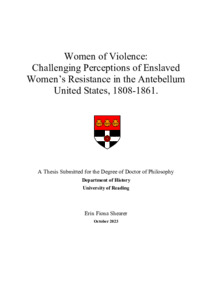 Shearer, E. F. (2024) Women of violence: challenging perceptions of enslaved women’s resistance in the antebellum United States, 1808-1861. PhD thesis, University of Reading. doi: 10.48683/1926.00115296