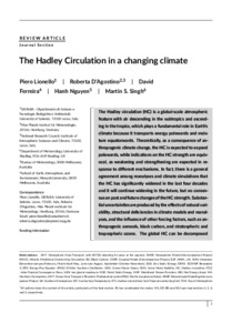 The Hadley circulation (HC) is a global-scale atmospheric feature with air descending in the subtropics and ascending in the tropics, which plays a fundamental role in Earth’s climate because it transports energy polewards and moisture equatorwards. Theoretically, as a consequence of anthropogenic climate change, the HC is expected to expand polewards, while indications on the HC strength are equivocal, as weakening and strengthening are expected in response to different mechanisms. In fact, there is a general agreement among reanalyses and climate simulations that the HC has significantly widened in the last four decades and it will continue widening in the future, but no consensus on past and future changes of the HC strength. Substantial uncertainties are produced by the effects of natural variability, structural deficiencies in climate models and reanalyses, and the influence of other forcing factors, such as anthropogenic aerosols, black carbon, and stratospheric and tropospheric ozone. The global HC can be decomposedin three regional HCs, associated with ascending motion above Equatorial Africa, the Maritime Continent, and Equatorial America, which have evolved differently during the last decades. Climate projections suggest a generalized expansion in the Southern Hemisphere, but a complex regional expansion/contraction pattern in the Northern Hemisphere.