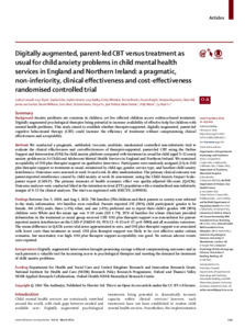 Creswell, C., Taylor, L., Giles, S., Howitt, S., Radley, L., Whitaker, E., Brooks, E., Knight, F., Raymont, V., Hill, C., van Santen, J., Williams, N., Mort, S., Harris, V., Yu, S., Pollard, J., Violato, M., Waite, P. and Yu, L.-M. (2024) Digitally augmented, parent-led CBT versus treatment as usual for child anxiety problems in child mental health services in England and Northern Ireland: a pragmatic, non-inferiority, clinical effectiveness and cost-effectiveness randomised controlled trial. The Lancet Psychiatry, 11 (3). pp. 193-209. ISSN 2215-0374 doi: 10.1016/S2215-0366(23)00429-7