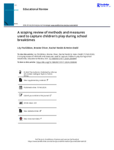 FitzGibbon, L., Oliver, B., Nesbit, R. and Dodd, H. (2025) A scoping review of methods and measures used to capture children's play during school breaktimes. Educational Review, 77 (6). pp. 1991-2016. ISSN 1465-3397 doi: 10.1080/00131911.2024.2306944
