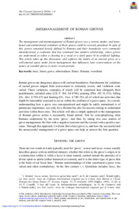 The management and mismanagement of Roman groves was a dangerous issue, and intentional and unintentional violations of these spaces could be severely punished. In spite of this, groves remained loosely defined by Romans and their boundaries were commonly misunderstood, a confusion that has continued into modern scholarship, where groves are understood as either a clearing in a wood or a dark space lit by artificial lighting. This article takes up this discussion, and explores the nature of a grove as a well-attested space of ancient forest management that influences later conversations on the nature of wooded spaces in more recent periods.