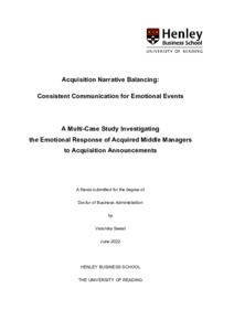 Sweet, V. (2022) Acquisition narrative balancing: consistent communication for emotional events: a multi-case study investigating the emotional response of acquired middle managers to acquisition announcements. DBA thesis, University of Reading. doi: 10.48683/1926.00115758
