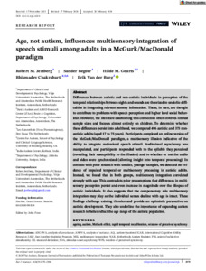 Jertberg, R. M., Begeer, S., Geurts, H. M., Chakrabarti, B. ORCID: https://orcid.org/0000-0002-6649-7895 and Van der Burg, E. (2024) Age, not autism, influences multisensory integration of speech stimuli among adults in a McGurk/MacDonald paradigm. European Journal of Neuroscience, 59 (11). pp. 2979-2994. ISSN 1460-9568 doi: 10.1111/ejn.16319